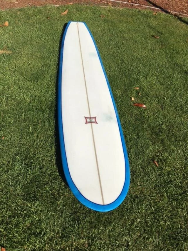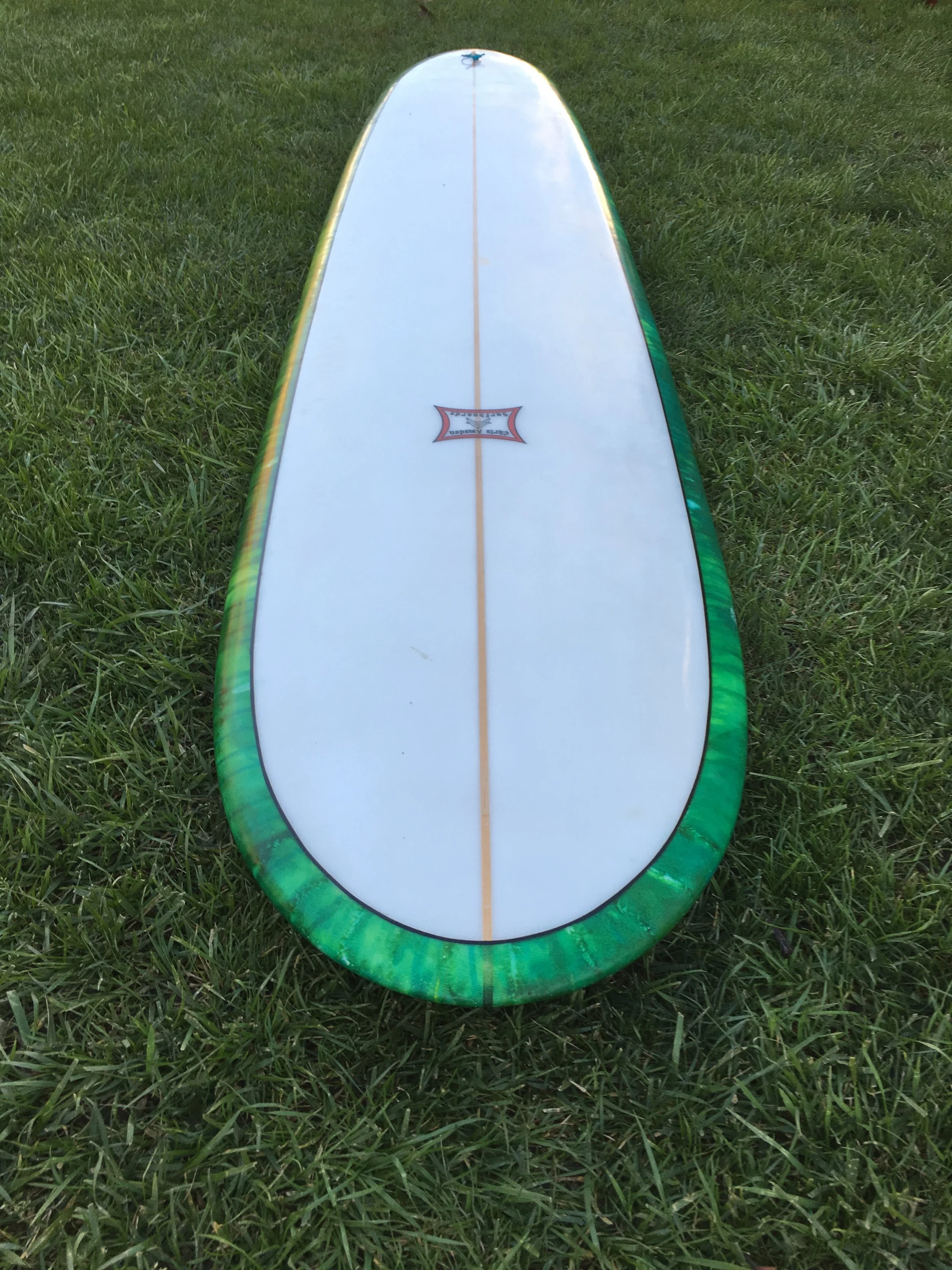 This was a 9'7" classic noserider done in the spirit of old-school 60s longboards. It had a glassed-on D-fin, with matching aloha stripes. The big D-fin isn't for everyone, but for those that like trimming and nose-riding, this is a great old-school design.